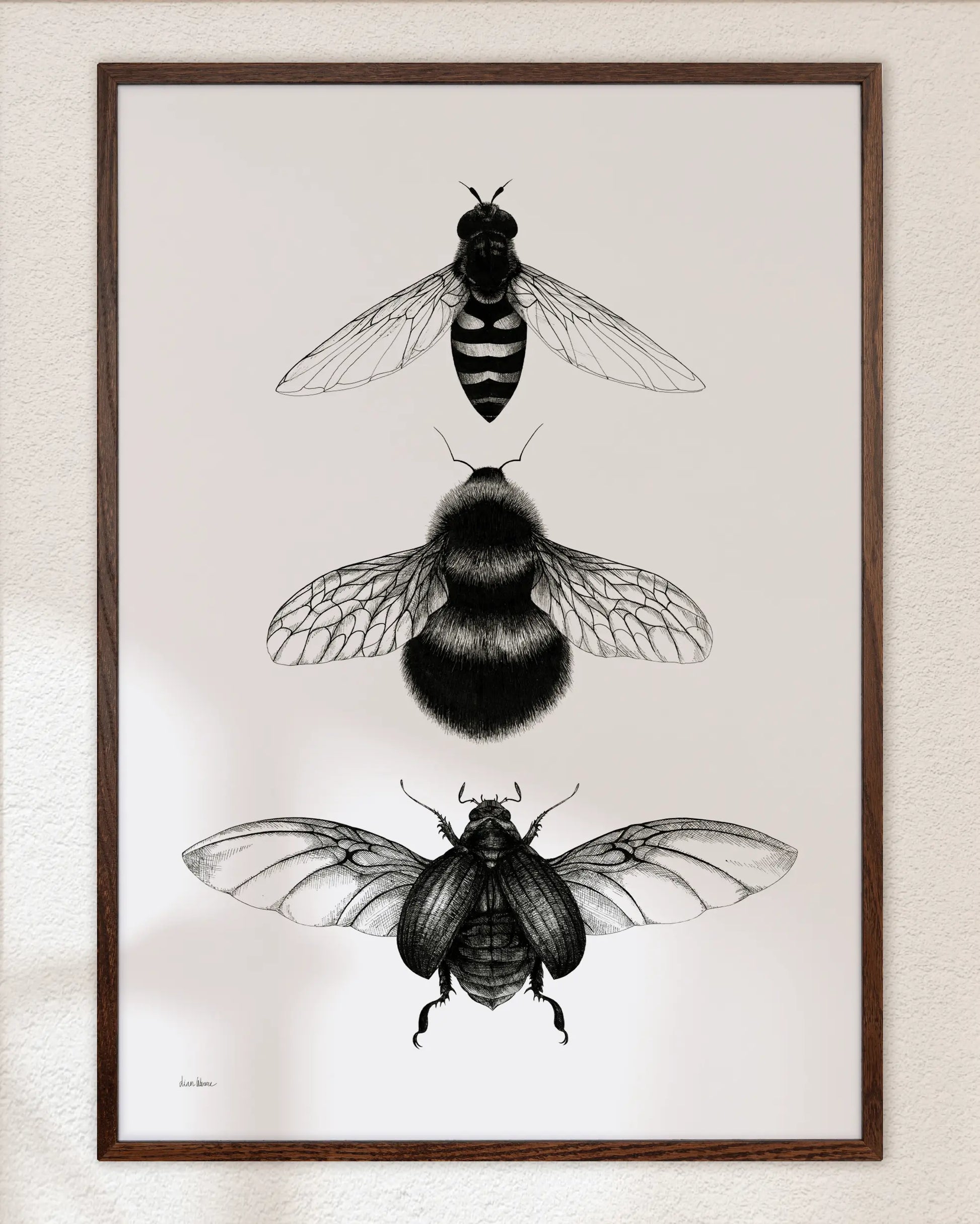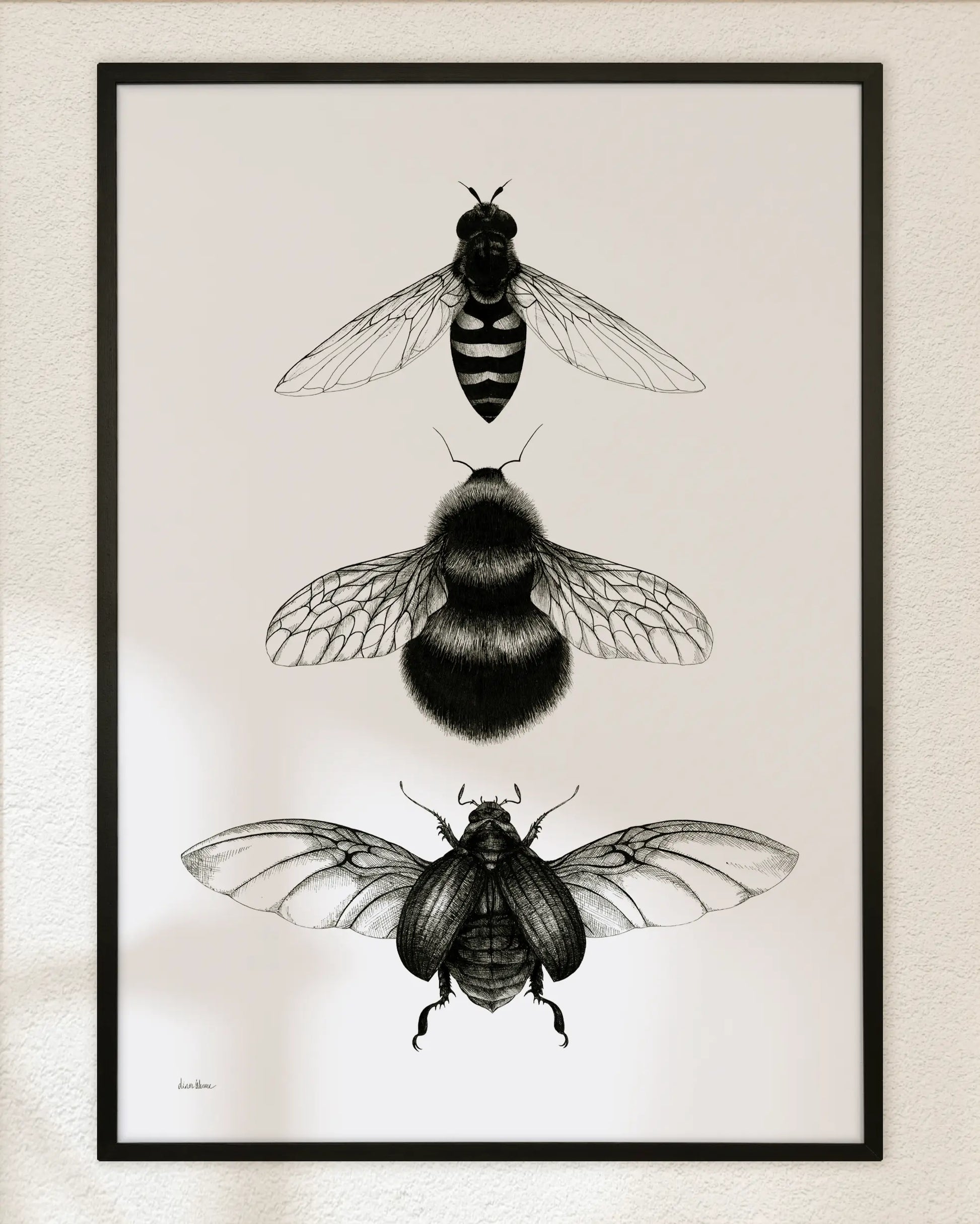 From my series of insect studies, I chose a bee, a bumblebee, and a scarab beetle—arranged in quiet formation. Drawn carefully in ink with attention to fine detail, this illustration captures their subtle differences and shared elegance. A calm and curious tribute to the quiet world of buzzing wings.