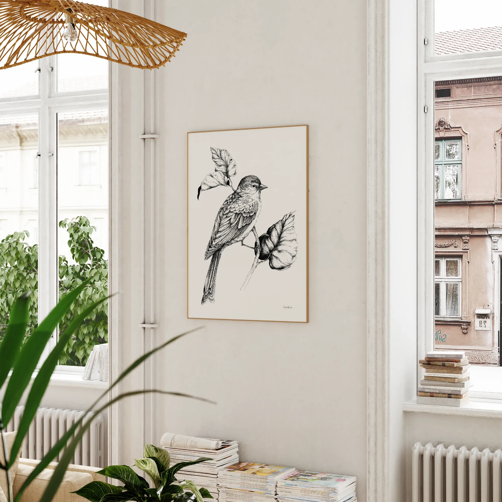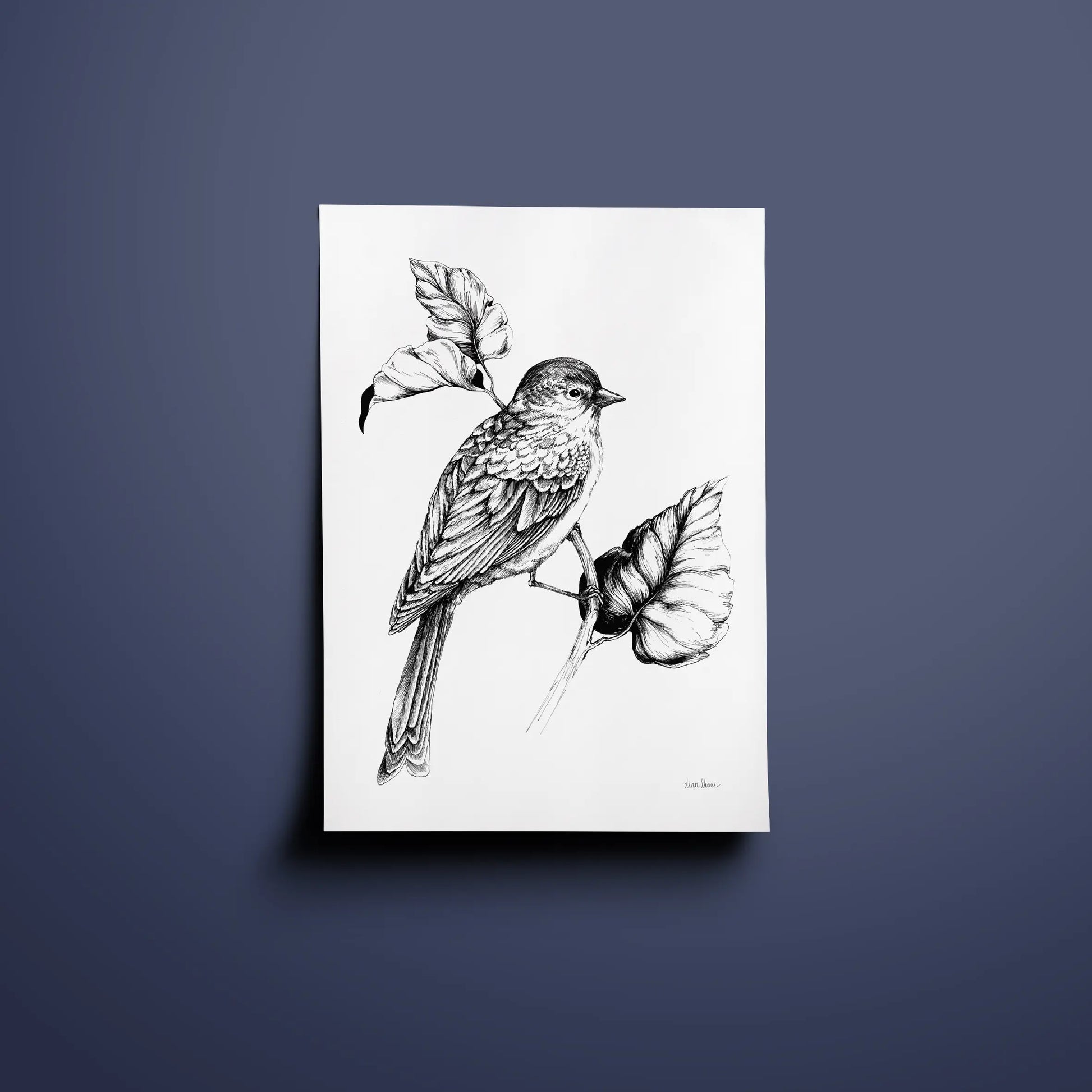 A single bird perched on a swaying branch, still and curious in the moment. Hand-drawn in ink with soft lines and a gentle rhythm. A simple moment captured in black and white.