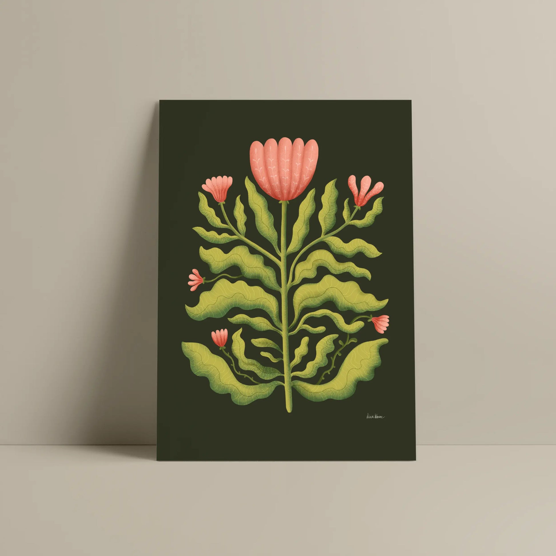 A tall, symmetrical bloom stands rooted and steady, its soft coral petals unfolding like a quiet celebration of balance. With flowing green leaves and a deep, earthy backdrop, this illustration captures the harmony of growth and stillness, a moment poised between light and dark like the turning of a season.
